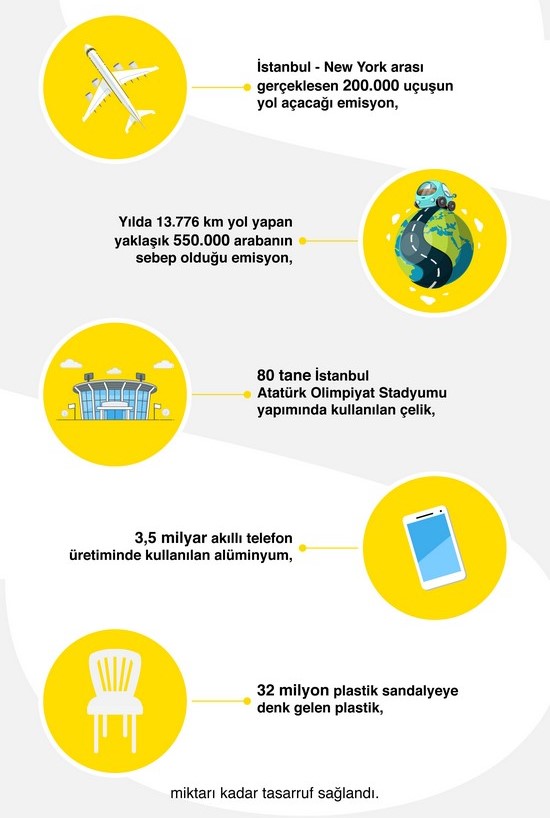 Bunun yanı sıra kullanıcılar ikinci el ürünleri tercih ederek; 800bin ton çelik, 70bin ton alüminyum ve 120bin ton plastik tasarrufu sağladı. Bu verilere göre; 800bin ton çelik 80 tane İstanbul Atatürk Olimpik Stadyumu[3] yapımında kullanılan çelik miktarına; 70bin ton alüminyum 3,5 milyar akıllı telefon üretiminde kullanılan alüminyum miktarına, 120bin ton plastik ise her biri 3,7 kilo ağırlığındaki 32 milyon plastik sandalyeye[4] karşılık geliyor.
