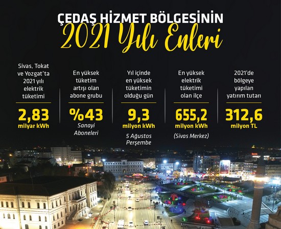 Sivas, Tokat ve Yozgat’ta elektrik dağıtım hizmeti veren Çamlıbel Elektrik Dağıtım A.Ş.’nin (ÇEDAŞ), ‘elektrik tüketim verilerinden’ hareketle oluşturduğu ‘Yılın Enleri Raporu’nun 2021 sonuçları açıklandı. Rapora göre 2021 yılında ÇEDAŞ’ın görev bölgesi içinde yer alan üç ildeki toplam elektrik tüketimi bir önceki yıla göre % 10,12 artarak 2 milyar 573 milyon kWh’den, 2 milyar 834 milyon kWh’ye ulaştı. Yıl içinde en büyük tüketim artışı Sivas’tan geldi.