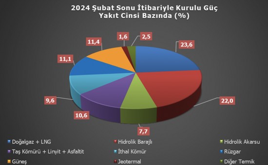 2024 yılı Şubat ayı sonunda oluşan toplam kurulu gücün %23,6’lık kısmı (25.403 MW) doğal gaz ve LNG yakıt tipi santralleri ile karşılanırken, %22,0’lık kısmı (23.654 MW) barajlı hidrolik santraller tarafından karşılanmaktadır. Bu yakıt tiplerini %10,6’lık (11.440 MW) oran ile yerli kömür santralleri ve %9,6’lık oran (10.374 MW) ile ithal kömür santralleri izlemektedir. Akarsu tipi hidrolik santraller %7,7’lik bir orana (8.321 MW) sahipken, rüzgâr santralleri toplam kurulu gücün %11,1’lik bir kısmını (11.909 MW) oluşturmaktadır. Toplam kurulu gücün %11,4’lük kısmı (12.296 MW) güneş enerjisi santralleri, %1,6’lık kısmı (1.691 MW) jeotermal enerji santrallerinden oluşurken, %2,5’lik kısmı (2.672 MW) ise diğer termik santraller tarafından oluşturulmaktadır.