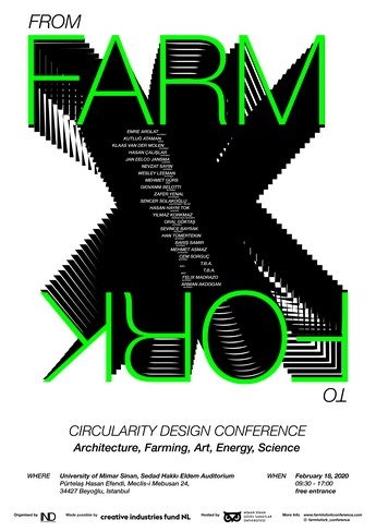 Yapılan son araştırmalara göre dünya gıda ihtiyacı 30 yıl sonra 60 kat artmış olacak. 2030 yılına geldiğimizde ise 122 milyon insan açlıkla yüz yüze gelecek. Türkiye’de ise son 10 yılda, Hollanda’nın yüz ölçümünün yarısı kadar tarım toprağı kaybedildi. Geleceği tasarlamak için çiftliklere entegre ve sürdürülebilir sistemler dizayn etmek her geçen gün daha çok önem kazanıyor. Bu gerçeklikten yola çıkarak Türkiye ve Hollanda’dan mimarlar, sanatçılar, bilim insanları, sosyologlar, araştırmacılar ve şehir planlamacıları ile şefler, “Farm to Fork” konferansında bir araya gelerek, tarımın alternatif geleceğini tartışacak. 18 Şubat 2020 tarihinde Mimar Sinan Güzel Sanatlar Üniversitesi Mimarlık Fakültesi’nde gerçekleştirilecek olan konferansın ana teması “Çiftlikten Sofraya” olacak. IND [Inter.National.Design] tarafından düzenlenen, Hollanda Stimulerings Fond ve Mimar Sinan Üniversitesi’nin desteği ile organize edilen etkinlik, 18 Şubat 2020 tarihinde saat 09:30’da başlayacak ve 19:30’da sonlanacak.