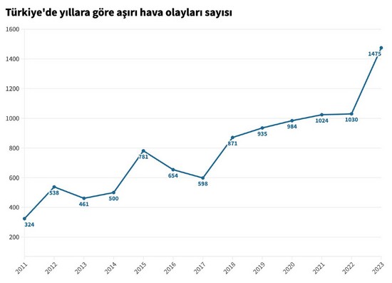 Türkiye’de yaşanan aşırı hava olaylarının sayısı 2023 yılında 1475’e çıkarak yeni bir rekor kırdı. Bir önceki yıl Türkiye’de görülen aşırı hava olaylarının sayısı 1030’du. Türkiye’de aşırı hava olaylarının sayısı son altı yıldır sürekli artıyor.
