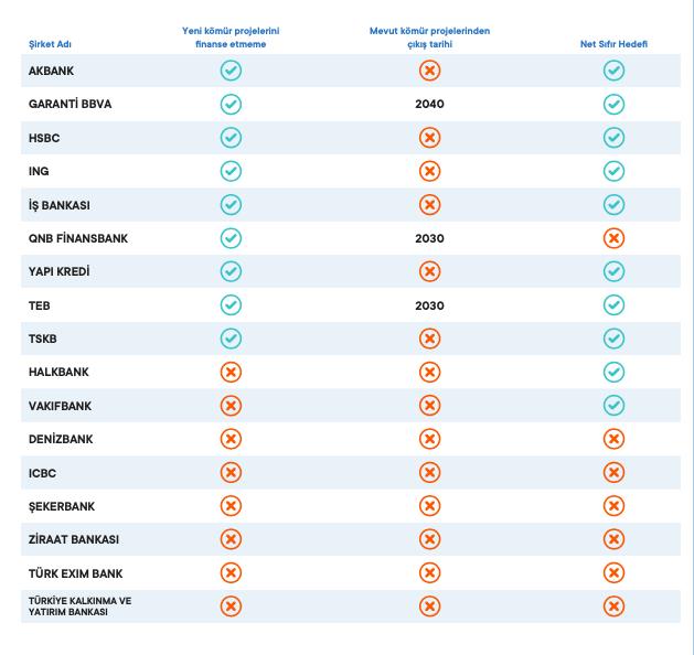 – Böylece rapora konu olan 17 bankadan 9’u kömüre “hayır” derken (Akbank, Garanti BBVA, HSBC, ING, İş Bankası, QNB Finansbank, YKB, TEB, TSKB), 10’u (Akbank, Garanti BBVA, HSBC, ING, Halk Bankası, İş Bankası, YKB, TEB, Vakıfbank, TSKB) net sıfır hedefine uygun olarak hareket edeceğini taahhüt etmiştir.