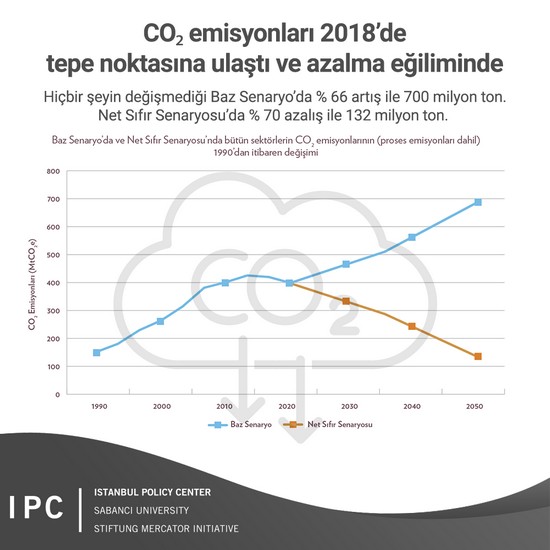 Net Sıfır Senaryosu’na göre, net sıfır hedefi doğrultusunda, tüm sektörlerde enerji tüketimi kaynaklı CO2emisyonlarının 2018 seviyesine göre 2030’da yüzde 37, 2050’de ise yüzde 80 azalarak 74 milyon ton CO2’ye inmesi mümkün. Sanayiden kaynaklanan proses emisyonları da hesaba katıldığında, ekonomi genelindeki CO2 emisyonları 2018’e göre 2030’da yüzde 32, 2050’de ise yüzde 70’e yakın azalarak 132 Milyon ton CO2’ye gerileyebilir.