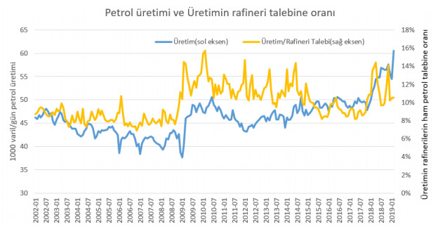 Grafikten görüldüğü üzere Türkiye’nin yerli petrol üretimi, veri setindeki en yüksek noktaya erişmiştir. Bu rakam 2002 yılından günümüze ortalama üretim rakamının neredeyse %50 fazlasıdır. Sarı çizgiye baktığımız zaman da, üretim her ne kadar rekor artışlar görmüş olsa da tüketim artışından dolayı, üretimin ham petrol talebindeki oranı sınırlı kalmaya devam etmiştir. Özellikle Star Rafinerisi’nin devreye girişi ile birlikte daha fazla ham petrol talebi ve daha az ithal ürün talebi ile bu rakam düşmeyi sürdürecektir.