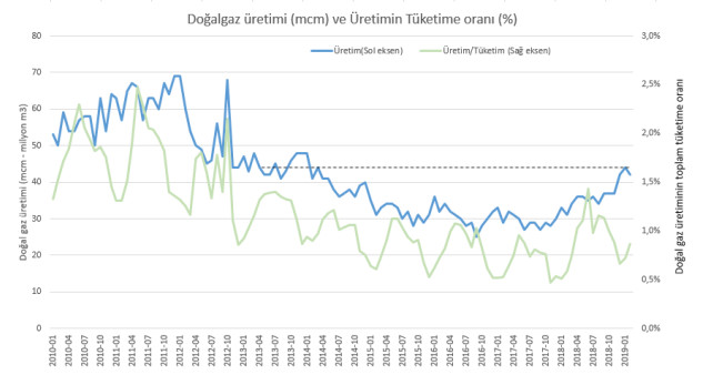 Doğalgazda da benzer bir durum vardır. Doğalgaz üretimi tekrar yükselmeye başlamış hatta 2014 Nisan ayından günümüze en yüksek seviyelere ulaşmıştır. Fakat üretimin tüketimi karşılama oranında çok küçük bir kıpırdama olmuştur. Önümüzdeki aylarda Türkiye petrol ve gaz üretiminde alınan yollar daha iyi görülebilecektir.