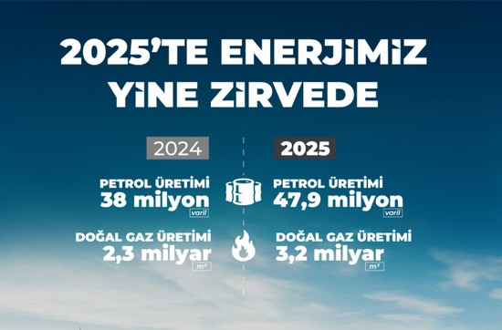 2024’te yıllık 38 milyon varil olan yurt içi petrol üretimi, 2025 yılında yüzde 26 artış ile 47,9 milyon varile ulaştı. Doğal gazda da 2024’te yıllık 2,3 milyar metreküplük Türkiye geneli üretim, 2025’te yüzde 39 artarak 3,2 milyar metreküpe çıktı. Enerji ve Tabii Kaynaklar Bakanı Alparslan Bayraktar, “2025’te yerli petrol ve doğal gaz üretiminde önemli bir hamle yaptık. 2026’da yerli kaynaklarımızı daha etkin kullanacağız.” dedi.