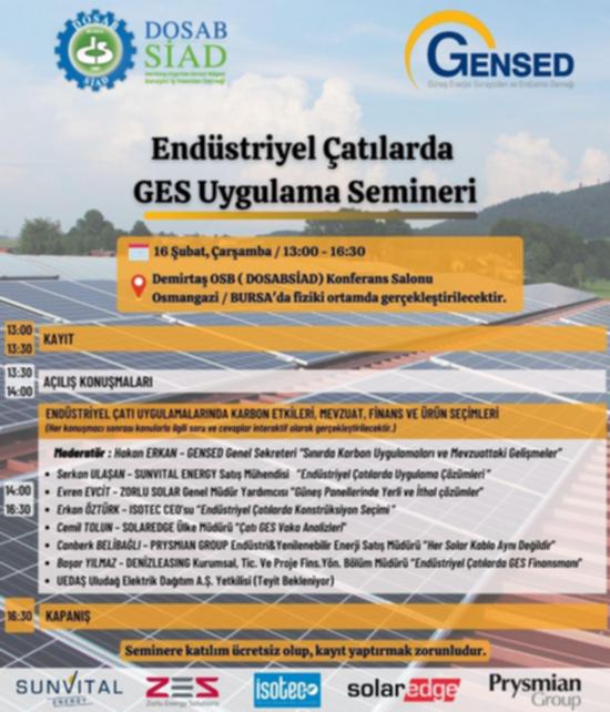 GENSED bu hedef doğrultusunda 2018 yılından beri gerçekleştirdiği “Endüstriyel Çatılarda GES Uygulama” seminerlerinin 17’ncisini 16 Şubat 2022 Çarşamba günü saat 13.00’te Bursa ilimizde bulunan Demirtaş OSB‘deki DOSABSİAD Konferans Salonu’nda düzenleyecek.