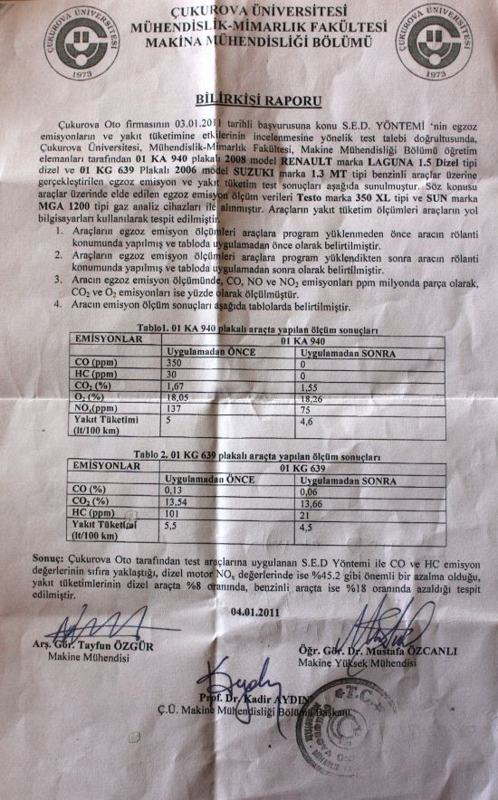 Çukurova Üniversitesi Makine Mühendisliği Bölümü, Otomotiv Anabilim Dalı Başkanı Prof. Dr. Kadir Aydın, Araştırma Görevlileri Tayfun Özgür ve Öğretim Görevlisi Mustafa Özcanlı’dan oluşan bilirkişi heyeti de farklı araçlar üzerinde yaptıkları testler sonucu yazılımla ilgili hazırladıkları raporda “Test araçlarına uygulanan SED yöntemi ile karbonmonoksit (CO) ve hidrokarbon (HC) emisyon değerlerinin sıfıra yaklaştığı, dizel motor azot oksit (NOx) değerinde ise yüzde 45.2 gibi önemli bir azalma olduğu, yakıt tüketimlerinin dizel araçta yüzde 8 oranında, benzinli araçta ise yüzde 18 oranında azaldığı tespit edilmiştir.” ifadesine yer verdi.