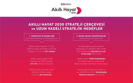 Zorlu Holding, dünyadaki paydaş temelli dönüşüme cevap verdiği Akıllı Hayat 2030 stratejisi doğrultusunda benimsediği “sorumlu yatırım holdingi” anlayışıyla; çevresel, sosyal ve yönetişim (ÇSY) alanlarında belirlediği değer yaratacak hedeflerini; grup şirketlerinin de sahiplendiği ve ihtiyaçları özelinde yönettiği bir dönemi başlatıyor. 2030 yılına kadar net sıfır emisyona ulaşmayı amaçlayan Zorlu Grubu, 2050 yılına kadar bu hedefi tüm değer zincirini kapsayacak hale getirecek. Atıkları 2030’a kadar %50 oranında azaltmayı ve 2050’ye kadar da sıfır atık noktasına ulaşmayı hedefleyen Zorlu Grubu, 2030’a kadar kullanılan suyun %50’sini, 2050’ye kadar da tamamını geri kazanmayı amaçlıyor. 2030’a kadar %100 sürdürülebilir tedarik zinciri hedefleyen Grup, ayrıca 2030’a kadar FAVÖK’ünün %1’ini Birleşmiş Milletler Sürdürülebilir Kalkınma Amaçları’na katkı veren çalışmalara ayıracak.
